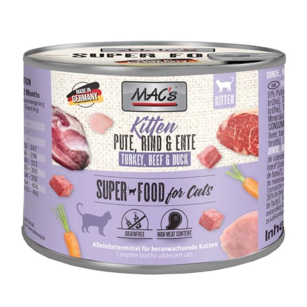 Mac's Cat konzerva pre mačiatka obsahuje 96 % morčacieho, hovädzieho a kačacieho mäsa a vnútorností, ktoré sú doplnené krehkú mrkvou a taurínom.