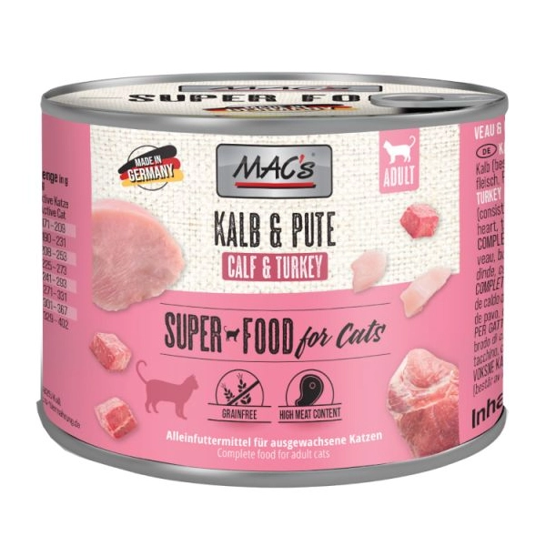 Konzerva pre mačky Mac's Cat obsahuje 96 % teľacieho a morčacieho mäsa a vnútorností, ktoré sú doplnené taurínom. Vhodná aj pre mimoriadne citlivú, vyberavú a maškrtnú mačku.
