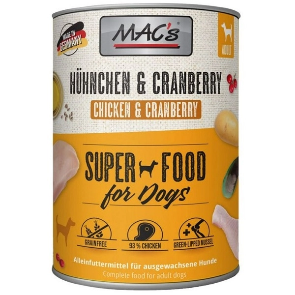 Kompletné bezobilné krmivo pre psov v konzerve Mac's - 95 % kuracieho mäsa a 3 % brusníc. Chutí aj najmaškrtnejším a najvyberavejším psom.