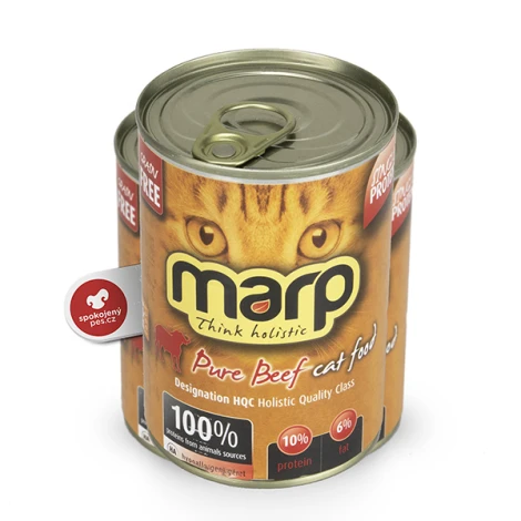 Marp Pure Beef Cat je výnimočná mäsová konzerva pre mačky. Obsahuje len kvalitné kúsky hovädzieho mäsa a srdca, pečene, pľúc a držiek a lahodný hovädzí vývar.
