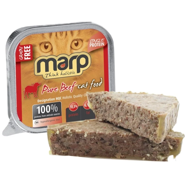 Holistické krmivo pre mačky, len z mäsa a vývaru. Marp Pure s hovädzím mäsom, srdiečkom, pľúcami a pečeňou je delikatesa. Mäkká konzistencia sa dobre prijíma, zloženie je úplne prírodný a bez obilnín. Vynikajúci spôsob, ako mačku potešiť aj voľným krmivom.