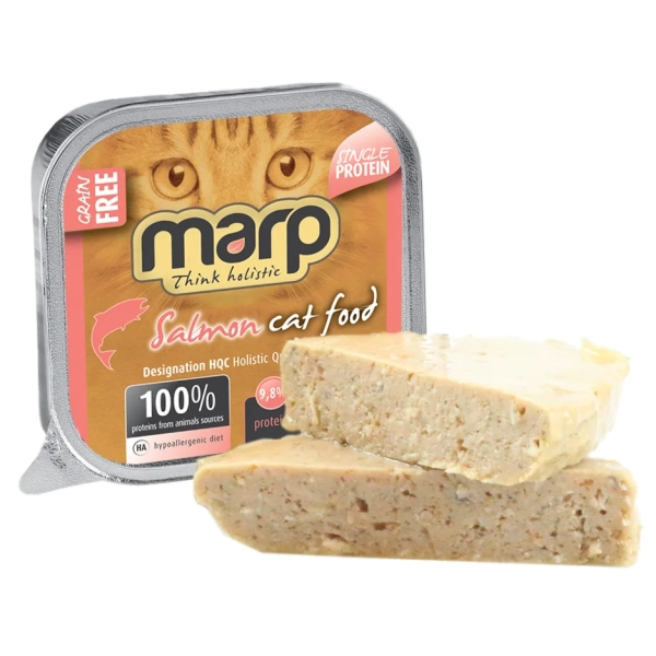 Holistické krmivo pre mačky, len z mäsa a vývaru. Marp Pure sa 70% obsahom mäsom z lososov je delikatesa. Mäkká konzistencia sa dobre prijíma, zloženie je úplne prírodný a bez obilnín. Vynikajúci spôsob, ako mačku potešiť aj voľným krmivom.
