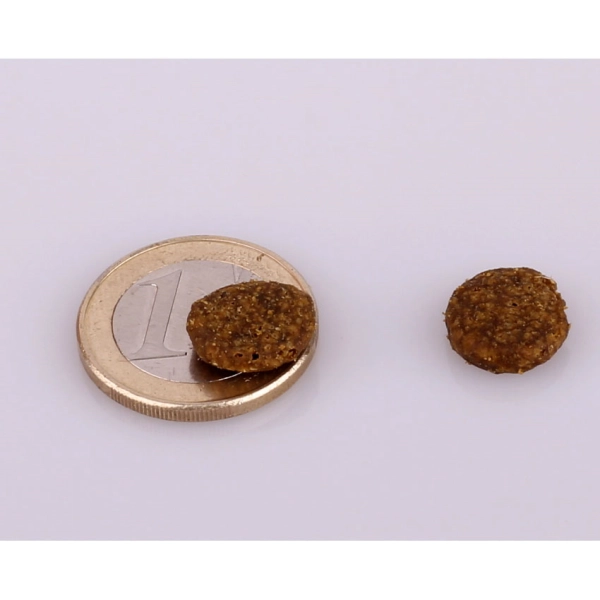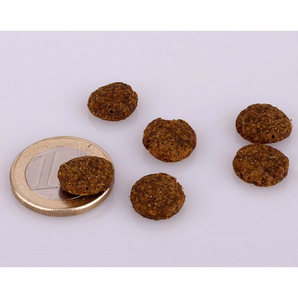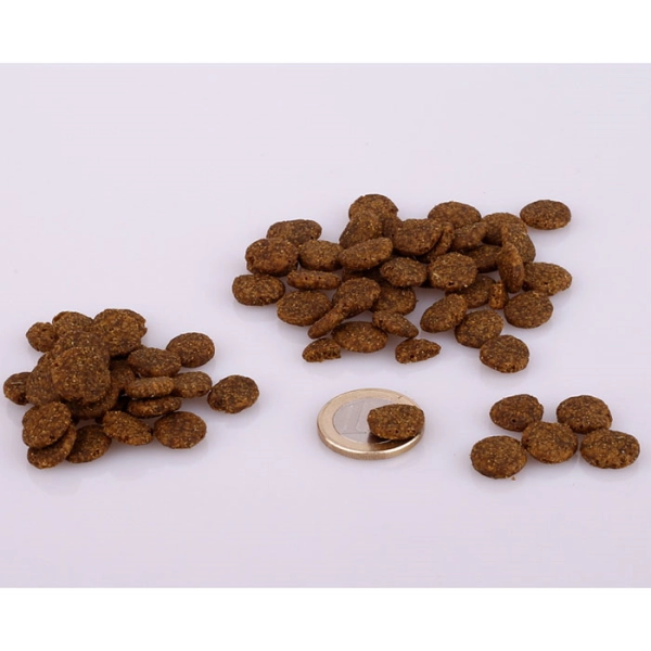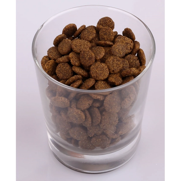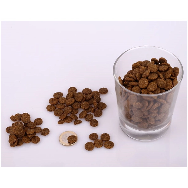 Hrubá bielkovina 28 %, hrubé tuky 15 %, vláknina 3,5 %, hrubý popol 7 %, vlhkosť 8 %, vápnik 1,4 %, fosfor 1,2 %, omega 3 0,40 %, omega 6 2,50 % .