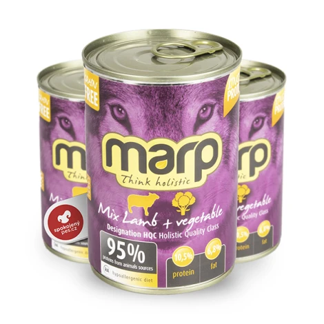 Holistické konzervované krmivo s jahňacím mäsom a zeleninou od českej značky Marp. Obsahuje výberové kusy mäsa aj zeleniny, zaliate čistým jahňacím vývarom. Hrubá paštéta s väčšími kúskami, ktorá