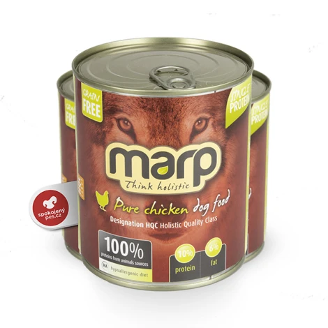 Holistické konzervované krmivo s kuracím mäsom od českej značky Marp. Obsahuje iba kuracie mäso, zaliate čistým vývarom. Konzerva je vďaka obsahu jedinej bielkoviny vhodná aj pre hypoalergénnu diétu. Hrubá paštéta s väčšími kúskami, ktorá neobsahuje obilniny ani konzervanty. Ideálne aj pre šteňatá, seniorov a gravidné sučky.