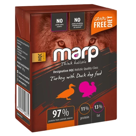 Holistické krmivo od obľúbenej značky Marp. Receptúra s morčacím a kačacím mäsom v kombinácii s mrkvou a rakytníkom zaručene poteší gurmánske chúťky vášho psa. Paštéta obsahuje až 97 % živočíšnych bielkovín. Vybrané vitamíny a minerály podporujú celkové zdravie organizmu. Veľkou výhodou tetrapaku je jeho praktickosť a ekologický aspekt. Obal je 100 % recyklovateľný a vďaka svojej nízkej hmotnosti sa výborne hodí na cesty. Receptúra je úplne bez obilnín, bez lepku a bez umelých konzervačných látok. Vhodná pre šteňatá, dospelých a starších psov, pre športovcov aj gaučových miláčikov.