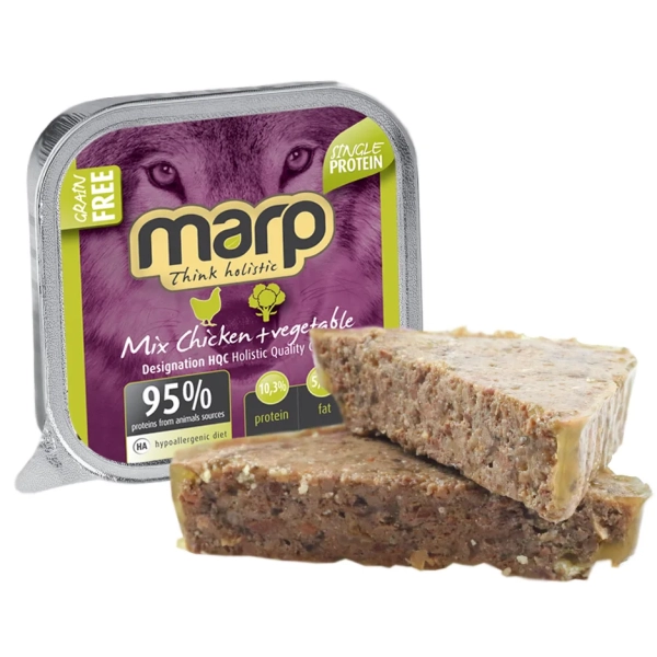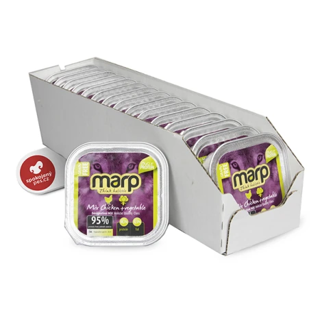 Holistická mäsová vanička s kuracím mäsom a zeleninou od českej značky Marp. Obsahuje výberové kusy mäsa aj zeleniny, zaliate čistým kuracím vývarom. Hrubá paštéta s väčšími kúskami, ktorá neobsahuje obilniny ani konzervanty. Ideálne aj pre šteňatá, seniorov a gravidné sučky.
