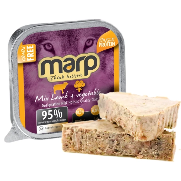 Holistická mäsová vanička s jahňacím mäsom a zeleninou od českej značky Marp. Obsahuje výberové kusy mäsa aj zeleniny, zaliate čistým jahňacím vývarom. Hrubá paštéta s väčšími kúskami, ktorá neobsahuje obilniny ani konzervanty. Ideálne aj pre šteňatá, seniorov a gravidné sučky.