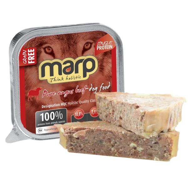 Holistická mäsová vanička s vynikajúcim hovädzím mäsom od českej značky Marp. Obsahuje tie najlepšie kúsky z plemena Angus, zaliate čistým vývarom. Paštéta je vďaka obsahu jedinej bielkoviny vhodná aj pre hypoalergénnu diétu. Hrubá paštéta s väčšími kúskami, ktorá neobsahuje obilniny ani konzervanty.