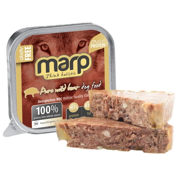 Holistická vanička s mäsom z diviaka od českej značky Marp. Obsahuje iba mäso z divokého prasaťa, zaliate čistým vývarom. Paštéta je vďaka obsahu jedinej bielkoviny vhodná aj pre hypoalergénnu diétu. Hrubá paštéta s väčšími kúskami, ktorá neobsahuje obilniny ani konzervanty.  Ideálne aj pre šteňatá, seniorov a gravidné sučky.