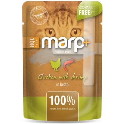Marp Holistic Plus kuracie mäso s krevetami vo vývare. Mačka je zásaditý mäsožravec, takže v nej nájdete bielkoviny len zo živočíšnych zdrojov. Žiadne obilniny, žiadne umelé zlepšujúce látky, len čisté mäso zaliate lahodným vývarom, ktorý privádza kapsičku k dokonalosti.