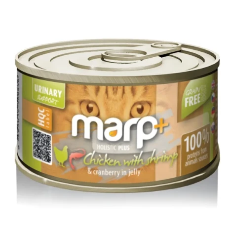 Marp Holistic Plus Cat konzerva s kuracími prsiami s celými krevetami a brusnicami v želé je gurmánska rozprávka s poriadnou porciou čistého mäsa. Žiadne vnútornosti, žiadne umelé prísady, žiadne obilniny.
