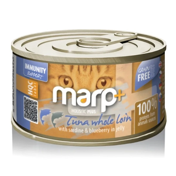 Filety z tuniaka so sardinkami v želé, to je pochúťka! Marp Holistic Plus Cat Tuna with Sardines and Blueberries sa môže pochváliť vynikajúcou receptúrou bez obilnín a maximálnym množstvom bielkovín zo živočíšnych zdrojov. Prémiové krmivo, ktoré bude vaša mačka absolútne zbožňovať.