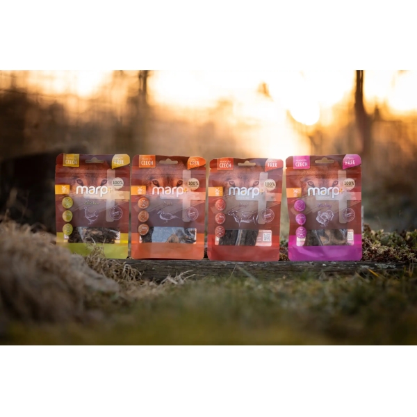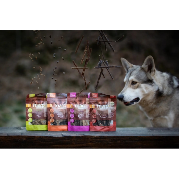 Keď skombinujete prírodné ingrediencie, šetrný výrobný proces a 90 % mäsa, získate recept, pod ktorý by sa podpísal aj pes labkou. Pochúťky pre psov Marp Holistic Plus hovädzie sú mäkké plátky mäsa vhodné na odmenu a potešenie. Vyrobené bez obilnín a v Českej republike.