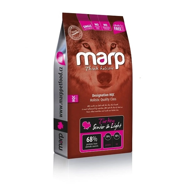 Marp Holistic Turkey holistické granule s morčacím mäsom pre dospelé psy, seniorov a psíky s nadváhou všetkých plemien. Jednodruhová receptúra bez obilnín (grain free), ktorá je vhodná aj pre psíky odkázané na hypoalergénnu stravu. Granule s morčacím mäsom sú vhodné aj pre psíky s citlivým trávením. Granule sú chutné a vysoko stráviteľné. Nižší obsah bielkovín a tukov pomáha udržiavať optimálnu hmotnosť. Pridaná kĺbová výživa pomáhá starať sa o pohybový aparát. Pivovarské kvasnice napomáhajú dobrému tráveniu a vstrebávaniu vitamínov a minerálnych látok, bylinky zasa podporujú imunitný systém. Pre zdravú a lesklú srsť je tu vyvážený pomer omega 3 a omega 6, s prídavkom zinku. Prírodná receptúra bez chemických konzervantov, farbív a hormónov.