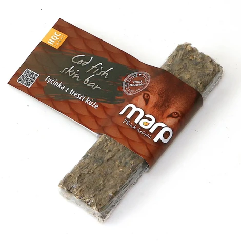 Lahodná tyčinka Marp Holistic je 100 % prírodná pochúťka, ktorá sa vyrába len z kože tresky. Má vysoký obsah bielkovín, podporuje zdravú kožu a srsť a pomáha odstraňovať zubný povlak a kameň. Tyčinka je bezpečnou alternatívou pochúťok z byvolej alebo hovädzej kože.