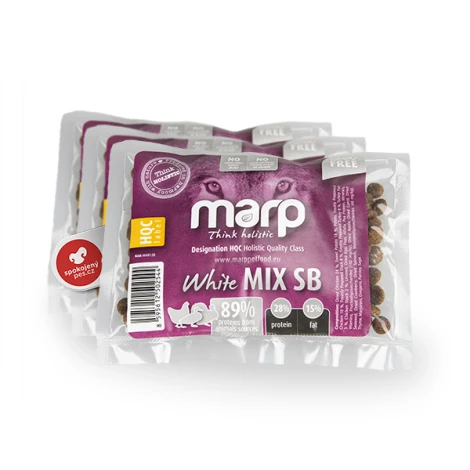 Marp Holistic White Mix Large Breed - holistické krmivo pre šteňatá a dospelé psy veľkých plemien. Multiproteínová receptúra s obsahom čerstvého kuracieho mäsa, kačky a morky. Granule sú chutné a vysoko stráviteľné. Hypoalergénna receptúra bez obilnín (grain free). Obsahuje prebiotiká pre zdravé trávenie a bylinky na podporu imunitného systému. Vyvážený komplex aminokyselín pre správne osvalenie a komplex kĺbovej výživy pre zdravý pohybový aparát. Prírodná receptúra bez chemických konzervantov, farbív a hormónov.