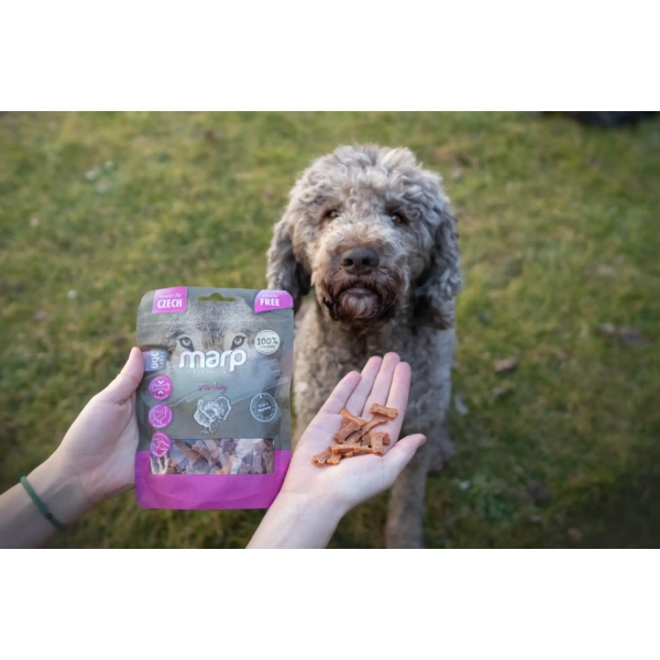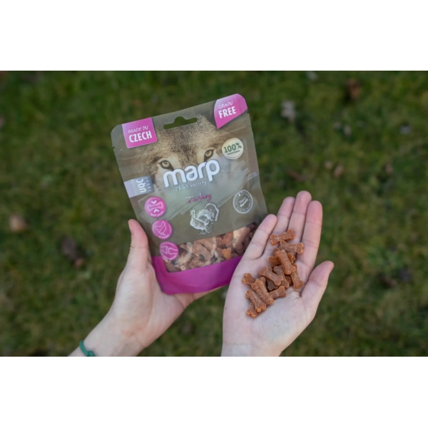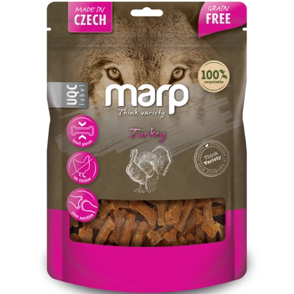 Pokušeniu, ktorému váš pes rád podľahne. Vylepšená verzia obľúbených odmen Marp Variety. Pochúťky z morčacieho mäsa pre psov sú mäkké kocky vyrobené z prírodných surovín, ktoré sú obzvlášť vhodné na výcvik. Špičková kvalita, vysoká chutnosť a žiadne obilniny. Vyrobené v Českej republike.