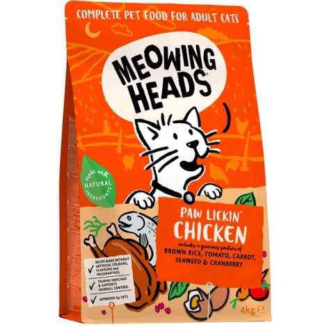 Úplne prírodné krmivo s kuracím mäsom pre dospelé mačky. Meowing Heads Paw Lickin' Chicken je delikatesa, na ktorej si vaša mačka pochutí každý deň. Kurča z voľného chovu dopĺňajú tie najkvalitnejšie rybičky a vajcia, ktoré obsahuje najľahšie stráviteľné proteíny, dôležité vitamíny a minerály. Paradajky a brusnice dodajú porciu antioxidantov a vitamínov a lososový olej, bohatý na omega 3 a omega 6 nenasýtené mastné kyseliny, pomôže znížiť prejavy kožných alergií. Bez umelých farbív, dochucovadiel či konzervačných látok.