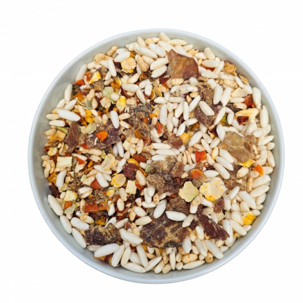 Pštrosie mäso poskytuje kvalitné bielkoviny, ryža je ľahko stráviteľná a šetrná k tráveniu, zelenina a ovocie ako mrkva, jablká, paradajky alebo tekvica dodávajú potrebné vitamíny a vlákninu.