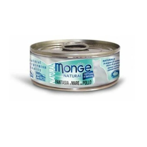 Šťavnatá pochúťka pre mačky Monge Cat Natural v konzerve s morskými plodmi a kuracím mäsom. Obsahuje úplne prírodné zložky, vďaka ktorým si konzervu zamiluje každá mačka.