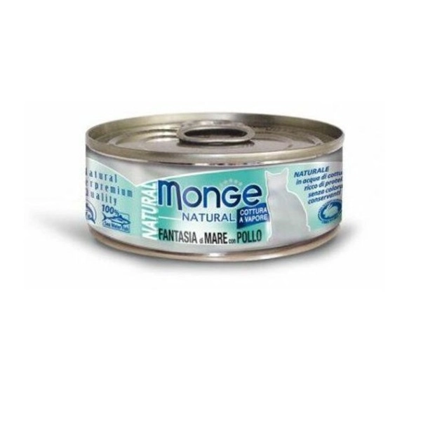 Konzerva Monge Cat Natural je varená v pare podľa talianskej receptúry - neobsahuje farbivá ani konzervačné látky. Vyznačuje sa vynikajúcou chuťou, čerstvosťou a vysokou výživovou hodnotou. Ryby obsahujú ľahko stráviteľné bielkoviny vysokej kvality a sú zdrojom nenasýtených mastných kyselín omega-3, ktoré majú pozitívny vplyv na cievny systém. Krmivo zároveň obsahuje minimálne množstvo nasýtených mastných kyselín, vďaka čomu si mačka ľahko udrží zdravú telesnú hmotnosť. Ryby sa lovia na otvorenom mori pomocou sietí zabezpečujúcimi bezpečnosť delfínov a iných väčších zvierat. Výrobok nebol počas vývoja ani výroby testovaný na zvieratách.