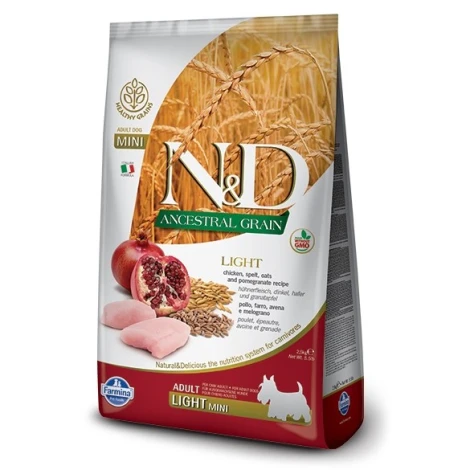 N&D Ancestral Grain Dog Light Mini Chicken & Pomegranate je kompletné krmivo s nízkym obsahom obilnín. Určené je dospelým psíkom malých plemien, ktorým robia starosti kilá navyše.