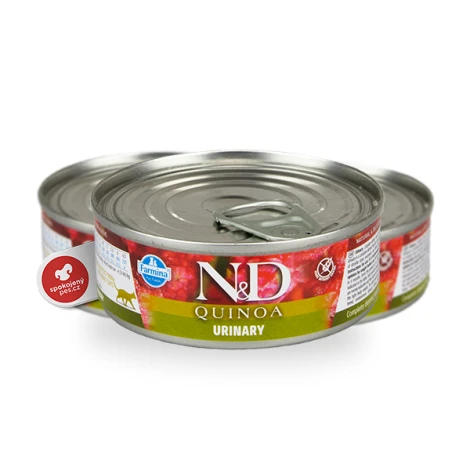 Delikatesné kompletné krmivo N&D s kačacím mäsom a brusnicami. Zloženie podporuje obmedzenie opakovanej tvorby struvitových kameňov a ochorení dolných močových ciest mačiek. Zdrojom sacharidov sú quinoa semienka.