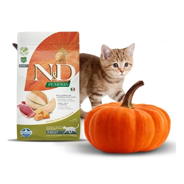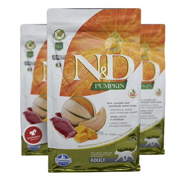Netradičné bezobilné krmivo pre dospelé mačky N&D s kačacím a kuracím mäsom a tekvicou. Krmivo prekypuje bielkovinami a prírodnými surovinami, ako je práve tekvica, vajíčka, hrášok, ryby alebo mrkva. Vhodné pre všetky dospelé mačky, ktoré potrebujú kvalitnú stravu plnú prírodných surovín.