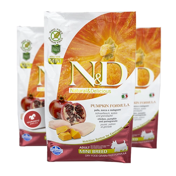 N&D Pumpkin je bezobilné krmivo s nízkym glykemickým indexom. Zloženie je založené na kuracom mäse, granátových jablíčkách a tekvici. Vhodné pre dospelých psov malých plemien. 60 % živočíšnych surovín, 40 % ovocie, zelenina a minerály.