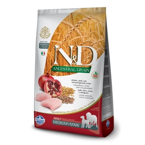 N&D Ancestral Grain Dog Adult Chicken & Pomegranate je kompletné krmivo pre dospelé psy stredných a veľkých plemien. Granule obsahujú nízke percento obilnín, základ tvorí ľahko stráviteľné kuracie mäso a atraktívne granátové jablko. Ideálne aj pre psov s citlivým trávením.
