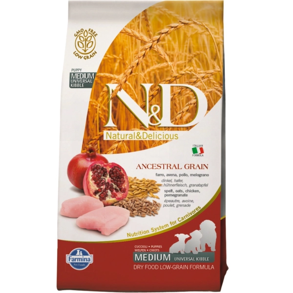 N&D Low Grain DOG PUPPY Chicken & Pomegranate (kura s granátovým jablkom) je kompletné krmivo pre šteňatá, gravidné a dojčiace sučky. Granule obsahujú minimum obilnín.
