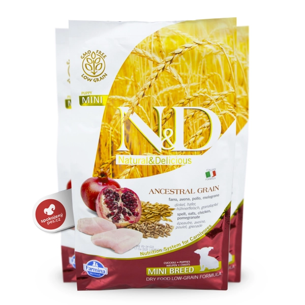 N&D Low Grain Dog Puppy Mini Chicken & Pomegranate (kura s granátovým jablkom) je kompletné krmivo pre šteňatá, gravidné a dojčiace sučky malých plemien. Granule obsahujú minimum obilnín.