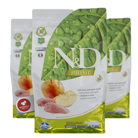 Bezobilné granule N&D Grain Free Adult Boar & Apple s mäsom z diviaka, čerstvým kuraťom a rybami. Kompletné krmivo pre dospelé mačky všetkých plemien, ktoré majú vyberavý jazýček.