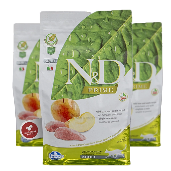 Bezobilné granule N&D Grain Free Adult Boar & Apple s mäsom z diviaka, čerstvým kuraťom, zemiakmi a rybami. Kompletné krmivo pre dospelé mačky všetkých plemien, ktoré majú vyberavý jazýček. Granule N&D Grain Free Adult Boar & Apple obsahujú tiež prebiotiká na podporu dobrého trávenia, správne osídlenie a funkciu črevnej sliznice a pre zdravý metabolizmus.