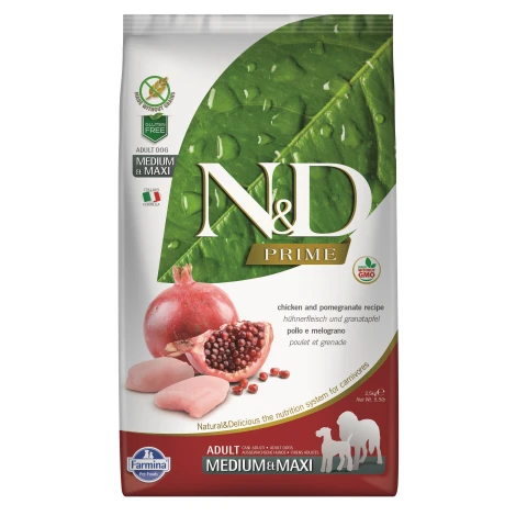N&D Prime Dog Adult M/L Chicken & Pomegranate je kompletné krmivo bez obilnín pre stredne veľké a veľké psíkov. Základom je kuracie mäsko, zemiaky, ryby, zelenina a ovocie.