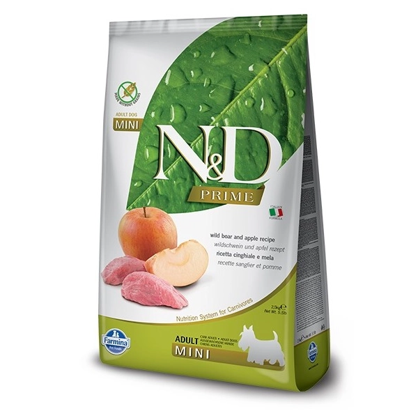 N&D Grain Free Dog Adult Mini Boar & Apple je špičkové bezobilné krmivo pre dospelých psov malých a mini plemien. Granulky sú drobné, prispôsobené najmenším psíkom.