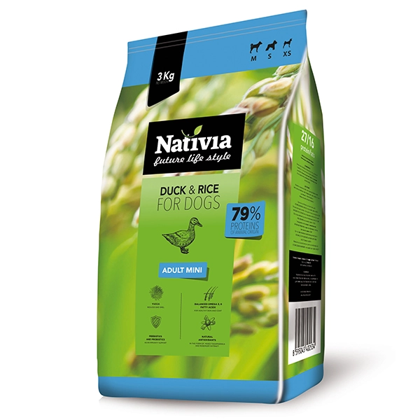 České kompletné krmivo Nativia Adult Mini Duck & Rice pre dospelých psov malých plemien od 10 mesiacov do 10 rokov. Starostlivo zostavená receptúra s kačacím mäsom a ľahko stráviteľnou ryžou neobsahuje kukuricu, pšenicu ani sóju, a tak nezaťažuje organizmus. 79 % živočíšnych bielkovín a rešpektovanie prirodzených zákonitostí výživy našich chlpatých priateľov, to je Nativia.