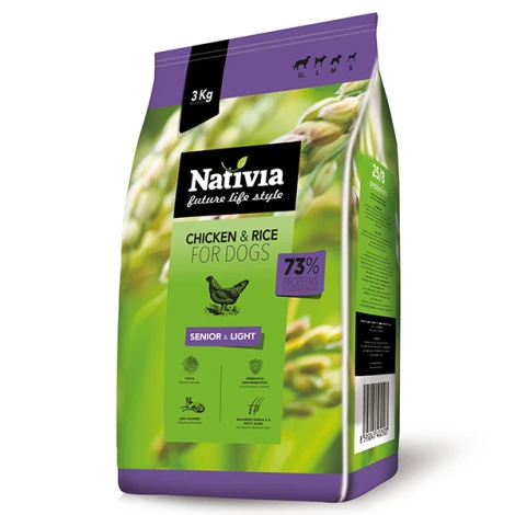 České kompletné krmivo Nativia Senior & Light pre psov všetkých plemien s nižšou aktivitou či sklonom k nadváhe od 18 mesiacov a pre starších psov od 8 do 10 rokov. Starostlivo zostavená receptúra s kuracím mäsom a ľahko stráviteľnou ryžou neobsahuje kukuricu, pšenicu ani sóju, čím nezaťažuje organizmus. 73% bielkovín živočíšneho pôvodu a rešpekt k prirodzenej zákonitosti výživy našich chlpáčov, to je Nativia.