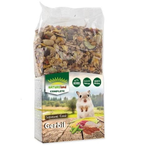 Superprémiové kompletné krmivo pre pieskomily Nature Land Complete. Toto vyvážené krmivo obsahuje rôzne druhy obilnín, veľké množstvo semienok, chrumkavého ovocia a zeleninu. Krmivo je zároveň obohatené o živočíšnu bielkovinu vo forme sušeného hovädzieho, kuracieho a rybieho mäsa.