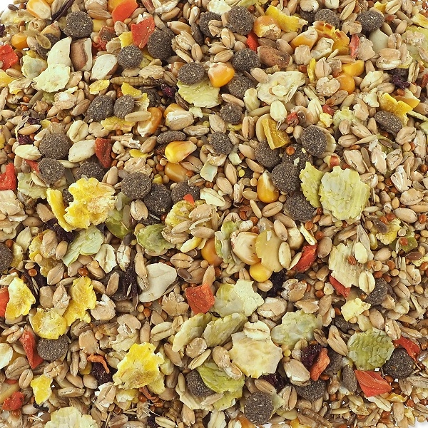 Pšeničné vločky, proso mana, proso la plata 14 %, kukurica 9 %, hrachové vločky 7 %, pšenica, kukuričné vločky, ovsené vločky, zelenina (sušená mrkva, sušená červená repa), semená tráv, arašidy, ryža, mäso (sušené hovädzie 0,9 %, sušené kuracie 0,9 %, sušené ryby), extrudovaná kukuričná múka, ľanové semeno, špalda, ovos, sušenie múčne červy.