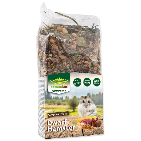 Superprémiové kompletné krmivo pre škrečky Nature Land Complete. Obsahuje vybrané druhy drobných zŕn, semienka, chrumkavú zeleninu a živočíšnu bielkovinu, ktorú potrebujú pre správnu funkciu organizmu. Špeciálne zloženie obsahuje vyvážený pomer živín, minerálnych látok a vitamínov  bez pridaného cukru,  vďaka ktorému má krmivo pozitívny vplyv na zdravie a kondíciu vášho maznáčika.  Starostlivo vybrané veľkosti zŕn a semien, tak aby zodpovedali anatómii lícnych vakov škrečkov, napomáhajú k prevencii zranení.