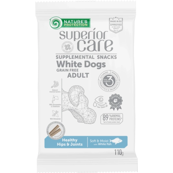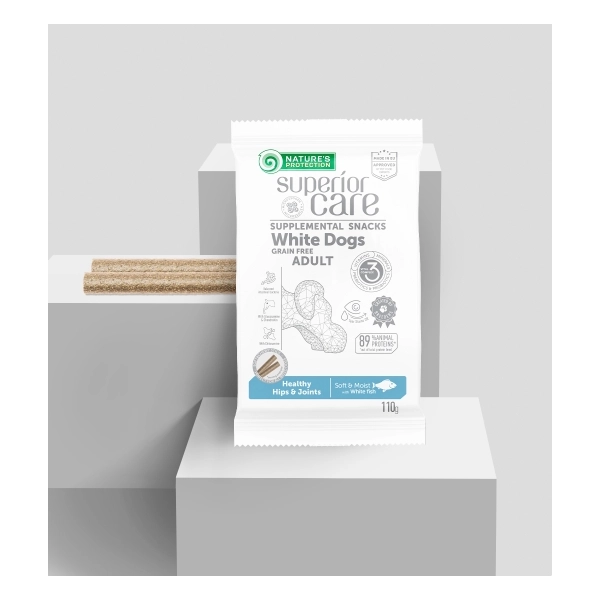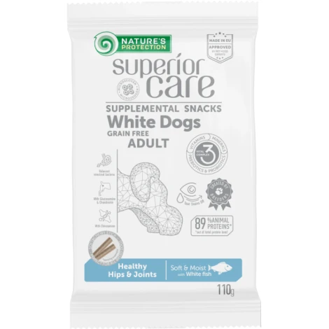 Funkčné tyčinky bez obilnín Nature's Protection Superior Care White Dogs Snack Healthy Hips & Joints s bielou morskou rybou pre dospelé psy všetkých plemien s bielou alebo svetlou srsťou. Špeciálna receptúra pomáha nielen odstrániť slzné škvrny okolo očí, ale vďaka glukozamínu, chondroitínu a chitozamínu prispieva aj k udržaniu pohyblivosti a celkovej funkcie kĺbov. Biela morska ryba patrí medzi nízkotučné druhy mäsa, takže pamlsky s extra kĺbovou výživou si môžu bez obáv vychutnať aj psy so sklonom k nadváhe.