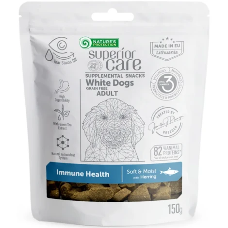 Funkčné polomäkké pamlsky Nature's Protection Superior Care White Dogs Snack Immunity so sleďom pre silnú imunitu u psov s bielou alebo svetlou srsťou. Receptúra bez obilnín nezaťažuje trávenie a funkčné zložky, ako morské riasy a zelený čaj, podporujú zdravie kože, srsti a obranyschopnosť proti baktériám.