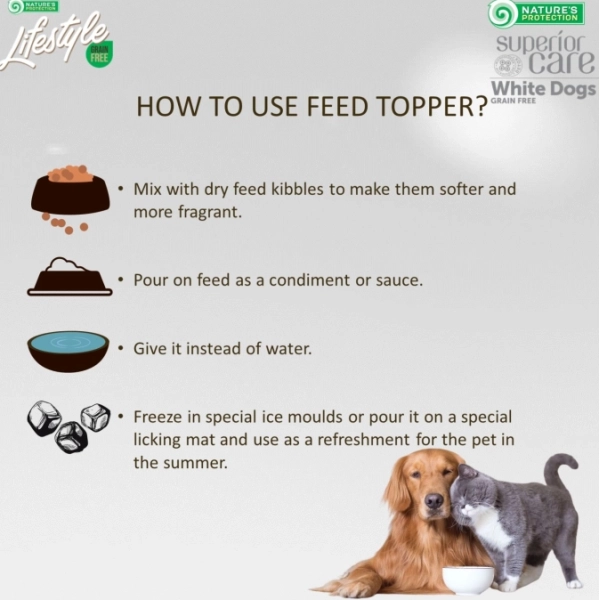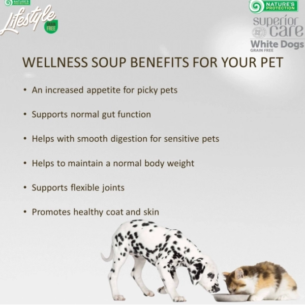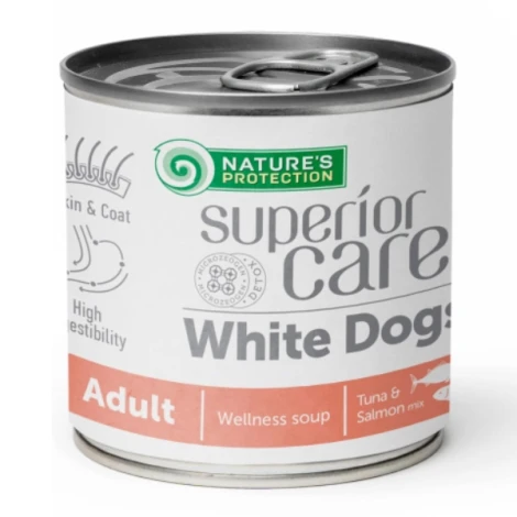 Polievka špeciálne pre dospelé psy s bielou a svetlou srsťou. Polievka Nature's Protection Superior Care White Dogs Wellness Soup Tuna & Salmon obsahuje lososa a tuniaka, ktoré vďaka obsahu omega-3 a omega-6 mastných kyselín pomáhajú udržiavať zdravú srsť a pokožku vášho miláčika.