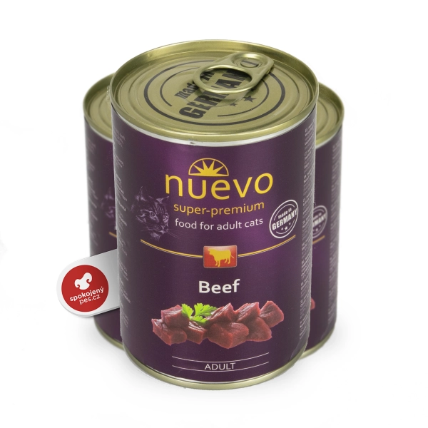 Hovädzie konzerva Nuevo Adult pre mačky.   Jedinečné, superprémiové krmivo pre mačky s extra vysokým obsahom mäsa (71%), ktoré je doplnené vývarom s plnou chuťou. Konzerva úplne pokrýva všetky nároky dospelých mačiek, má ideálne vyvážený obsah bielkovín, karbohydrátov, tukov a minerálov. Neobsahuje sóju ani žiadna chemické aditíva. Vyrobené v Nemecku.