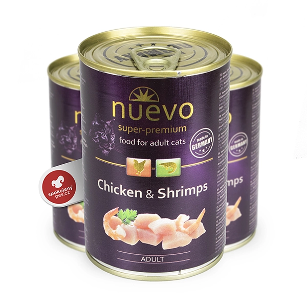 Konzerva Nuevo s kuraťom a krevetami. Jedinečné, superprémiové krmivo pre mačky s extra vysokým obsahom mäsa (71%), ktoré je doplnené vývarom s plnou chuťou. Zloženie je založené na výberových zdrojoch bielkovín - na kuracom mäse a krevetách. Túto kombináciu čerstvých prísad si zamilujú aj vyberavé mačky. Krevety sú prirodzene bohaté na mastné kyseliny omega-3 a omega-6, prospievajú veľkolepému a zdravému rastu kožuchu.