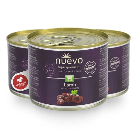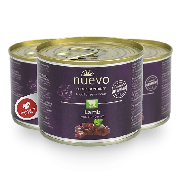 Jedinečné, superprémiové konzervy Nuevo Senior pre mačky. Vynikajú svojim extra vysokým obsahom mäsa (68%), ktoré je doplnené vývarom s plnou chuťou a brusnicami pre zdravé prostredie močových ciest. Konzerva úplne pokrýva všetky nároky starších mačiek, vďaka lososovému oleju dodá perfektný výživu aj kožúšku a kožu. Zloženie je vhodné pre menej aktívne mačky a mačky v seniorskom veku. Neobsahuje sóju ani žiadna chemické aditíva. Vyrobené v Nemecku.