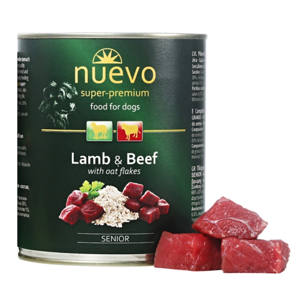 Konzerva pre psa Nuevo Senior s jahňacím mäsom a s ovsenými vločkami. Kompletné superprémiové krmivo pre starších psov všetkých plemien.