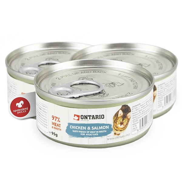 ONTARIO konzerva Chicken Pieces & Salmon - kuracie kúsky a losos. Lahodná mäsová konzerva pre dospelé mačky.